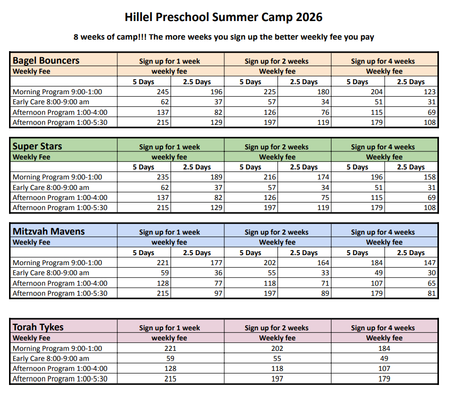 Thank you for considering the Hillel Preschool Summer Camp! We look forward to providing your child with a great summer filled with activities, friendship, and learning.